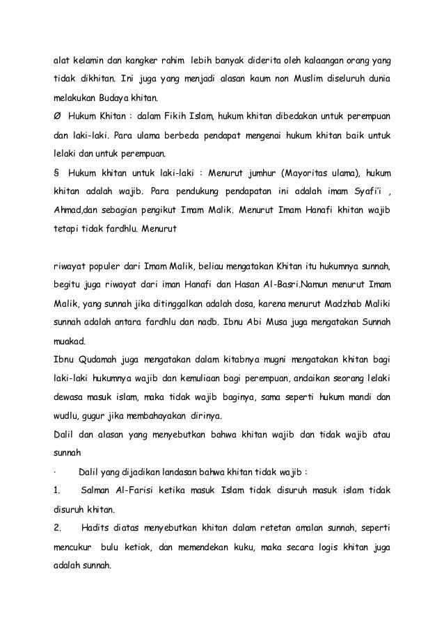 Hukum khitan/sunat bagi perempuan/wanita. Dari beberapa hadist di atas, sangat wajar jika para ulama berbeda pendapat tentang hukum khitan wanita. Tapi yang jelas semuanya mengatakan bahwa khitan wanita ada dasarnya di dalam islam, walaupun harus diakui bahwa sebagian dalilnya masih samarsamar. Khitan dalam islam ma'had 'aly lilbanat "hidayaturrahman". Hukum berpestapora dalam perayaan khitan berpesta dalam perayaan khitan, kami tidak mendapatkan dasarnya sama sekali dalam syari'at islam yang suci ini. Adapun perasaan senang dan gembira karenanya, merupakan hal yang sudah seharusnya, karena khitan merupakan perkara yang disyariatkan.Allah telah berfirman, artinya "katakanlah. Hukum khitan bagi wanita majalah islam asysyariah. Bagaimana hukum sunat bagi perempuan menurut hukum islam? Jazakumullah khair sebelumnya atas jawabannya. Heru r heruxxxxxx@gmail. Bismillah. Khitan bagi wanita juga disyariatkan sebagaimana halnya bagi pria. Memang, masih sering muncul kontroversi seputar khitan bagi wanita, baik di dalam maupun di luar negeri. Contoh makalah khitan perempuan menurut islam (lengkap). 2.2 hukum khitan. Dalam fikih islam, hukum khitan dibedakan antara untuk lelaki dan perempuan. Para ulama berbeda pendapat mengenai hukum khitan baik untuk lelaki maupun perempuan. 2.2.1 hukum khitan untuk lelaki. Menurut jumhur (mayoritas ulama), hukum khitan bagi lelaki adalah wajib. Hukum mengadakan pesta sunatan (walimatul khitan). Jawabannya, perlu. Tetapi harus dibedakan antara kenduri dalam arti mengundang masyarakat meskipun hanya sepuluh orang lalu menghidangkan mereka jamuan sepatutnya dan pesta dalam arti glamour dan bermewahmewahan. Kalau walimatul khitan diartikan mengundang sejumlah anggota masyarakat dan menghidangkan makanan, ini perlu. Khitan dalam islam fiqh imam syafi'i madinatul 'ilmi. Dalam agama islam, khitan dalam fikih islam, hukum khitan dibedakan antara untuk lelaki dan perempuan. Artinya perayaan. Ibnu hajar menukil pendapat imam.